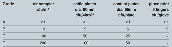 表1:pic/s附錄1微生物污染推薦限值(a)。注:(a)這些是平均值,(b)單個(gè)沉降板可暴露不到4小時(shí)。
